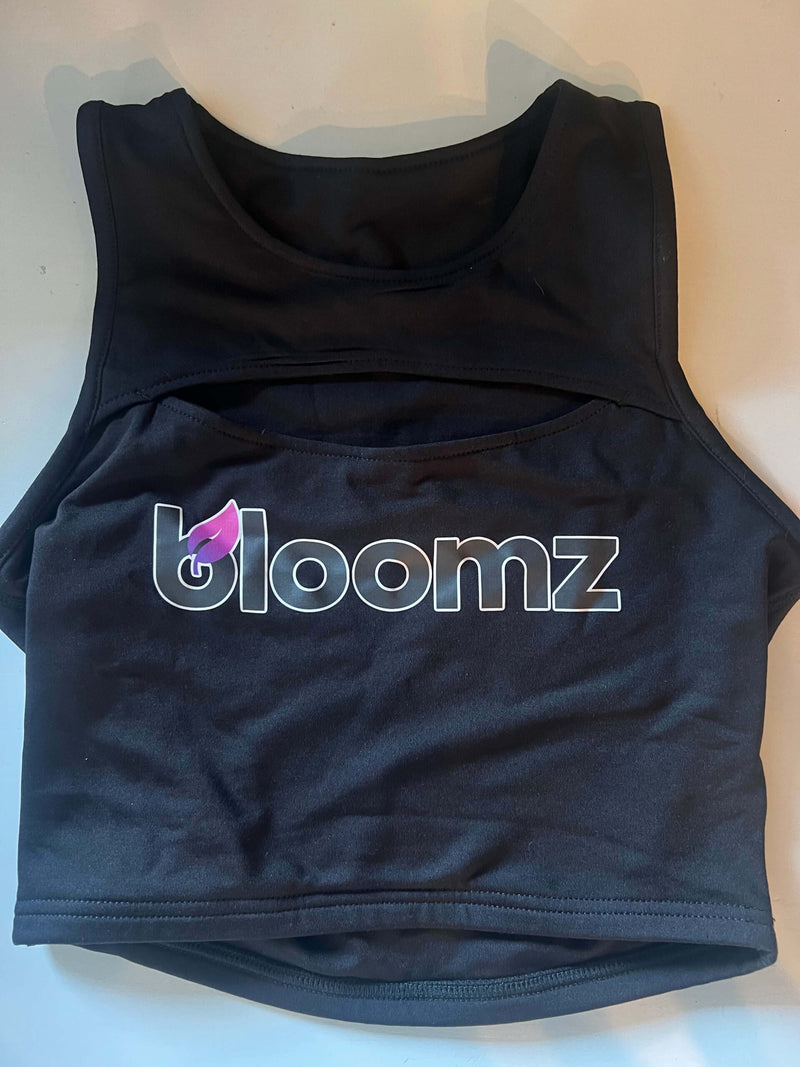 Bloomz Hemp black logo on a black shirt