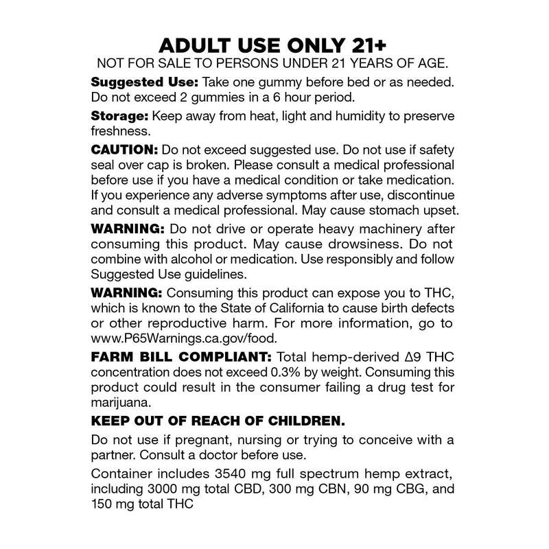 All Ingredients: Corn Syrup, Sugar, Water, Pectin, Citric Acid, Sodium Citrate, Full Spectrum Hemp Extract,, L-Theanine, Lemon Balm, GABA, Natural Flavors, and Natural Color.