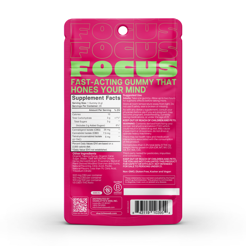 Shift your view into focus with fast-acting Focus THC gummies. Each delicious Raspberry Lime flavored gummy contains a precise and moderate dose of 5mg THC with 25mg CBG & 7.5mg CBD to help take your mind off your worries so you can focus in 15 minutes or less on whatever you desire to do on the Brightside of life.Â