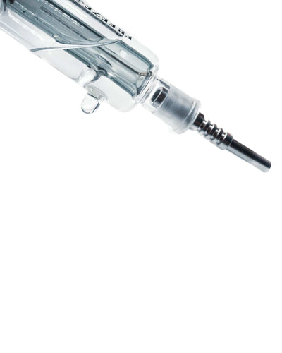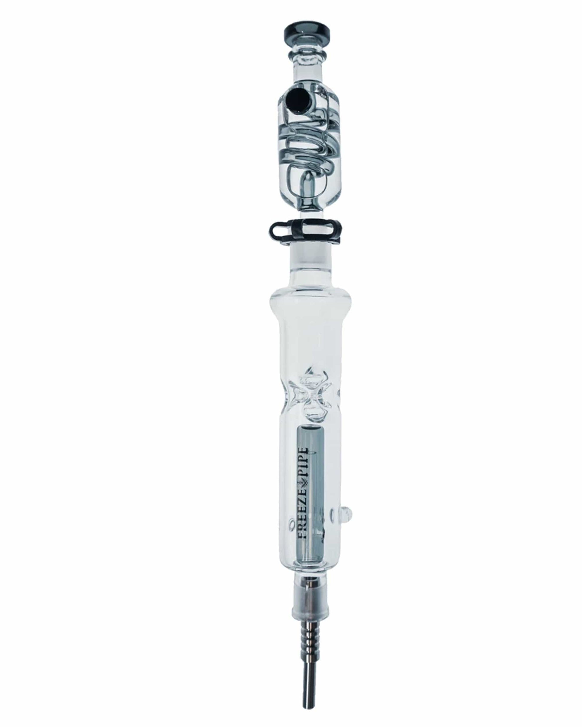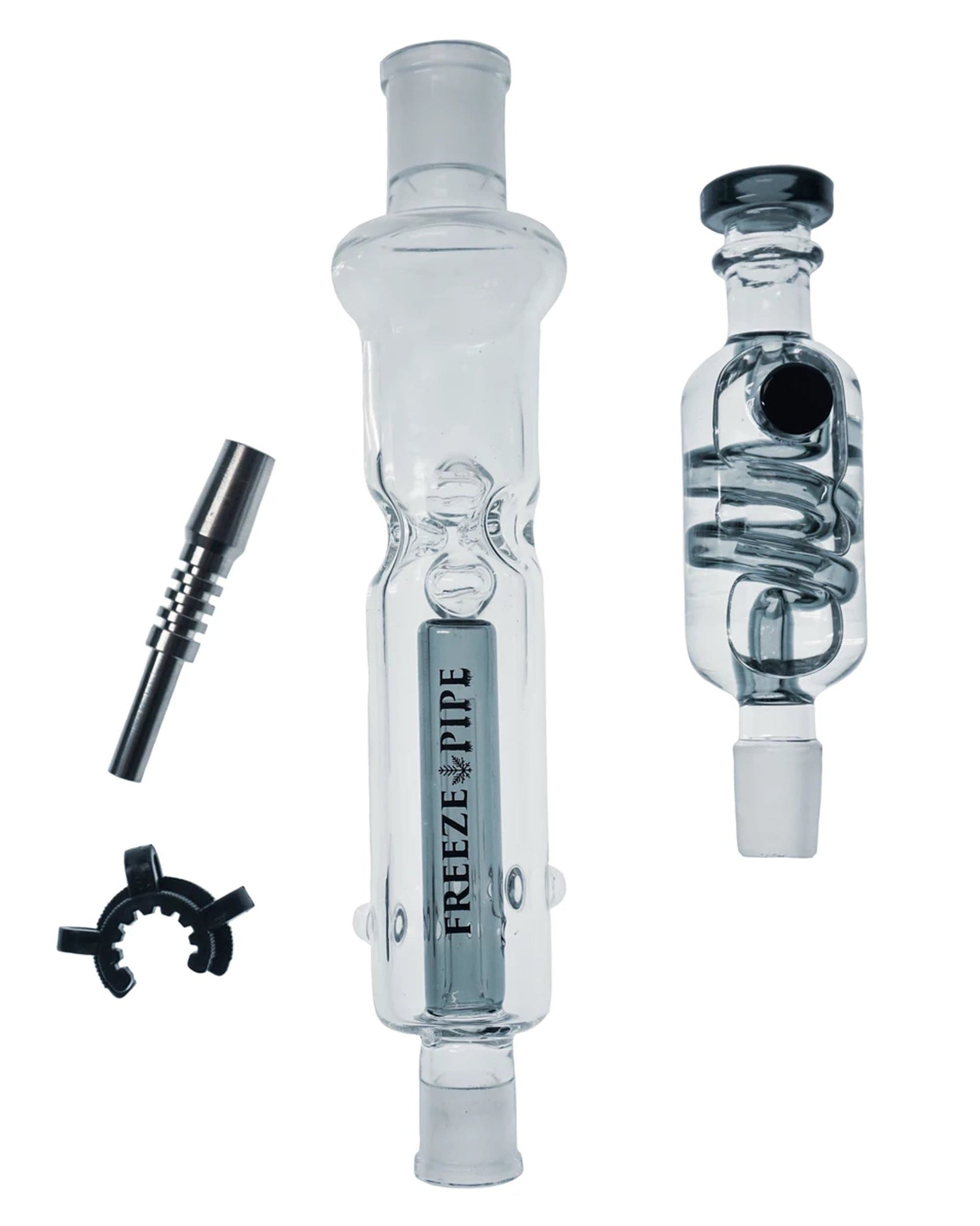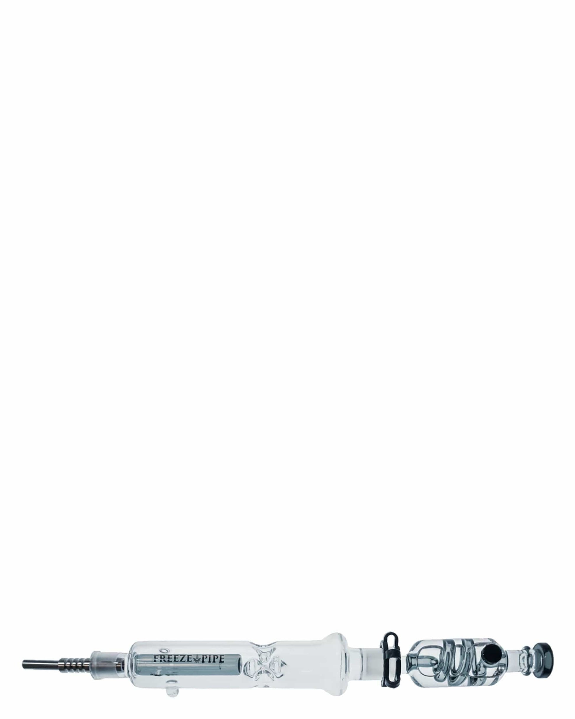 The Freeze Pipe Nectar Collector Kit is shatter resistant, assembles quickly and securely with frosted joints, all parts secured with plastic locking clips. The kit includes the standard glycerin coil, glycerin-filled straight tube, a glass dab dish, and a thermal wrap to keep coils chill.