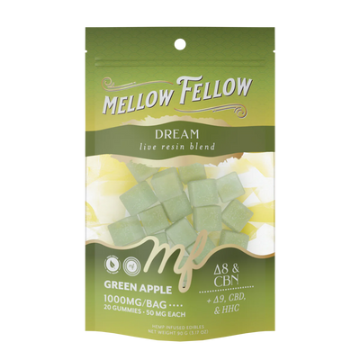 Dream Live Resin Gummies are a tart green apple twist on your sweetest dreams. This soothing Delta 9 THC blend is perfect for unwinding after a long day or setting the mood for a chill evening. With each gummy, you can expect to ease into a state of calm as your worries fade and your body melts into total comfort.