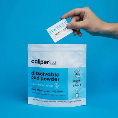 Looking for a convenient way to boost your natural wellness on-the-go? Tired of those mixable wellness powders that don’t actually mix well and end up leaving clumps of chalky powder in your food or drink? With Flavorless Caliper CBD Dissolvable Powder those days are over! This tasteless CBD powder mixes quickly and cleanly in any beverage or food, hot or cold, without the clumps. It comes in convenient 20mg packets that can be kept in the kitchen, handbag, pocket, or suitcase; no measuring, no mess, and no weird flavors.