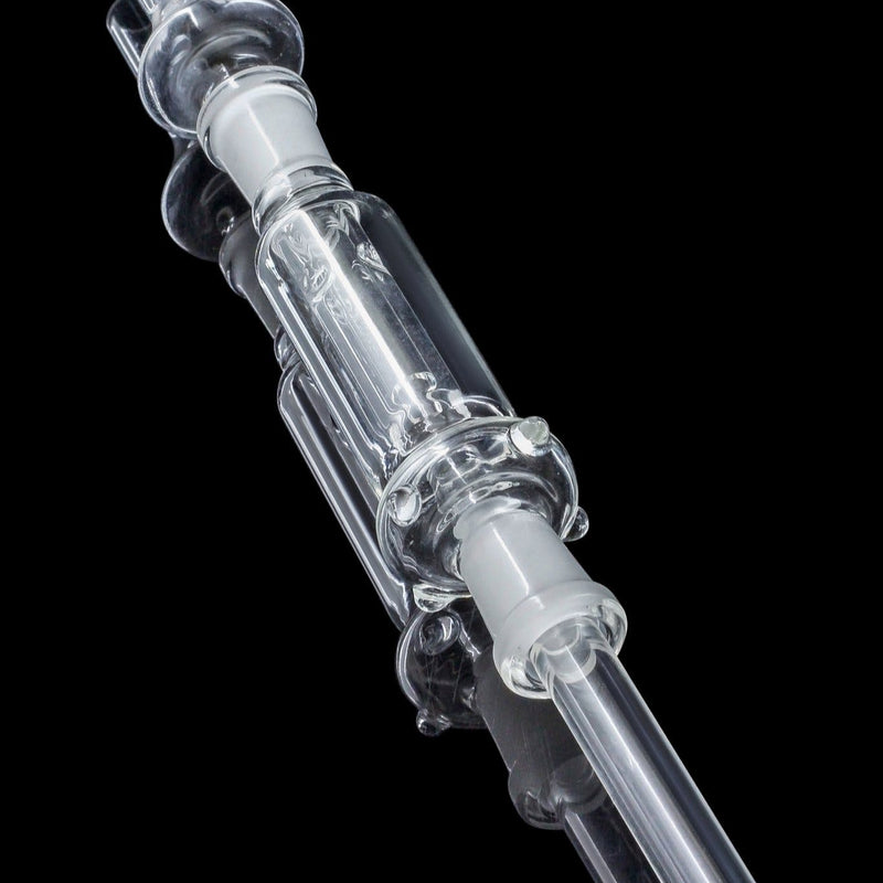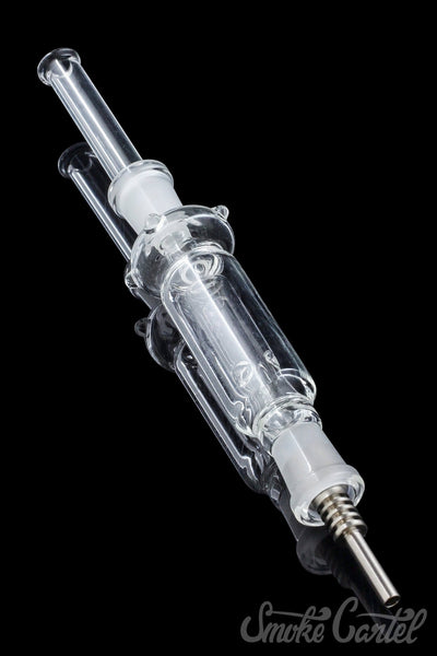 The Honey Funnel Dab Pipe w/ Ti and Quartz Tips is a 5.25 inch long portable hand-held, water-cooled nectar collection (or dab straw) featuring durable boro glass body parts, a splash guard dome diffuser perc, straight tube mouthpiece and a 10mm F ground joints. Matching titanium and quartz nails included. Glass dab dish included.