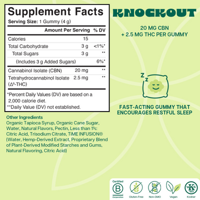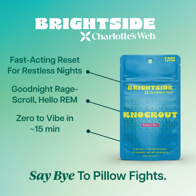 Brightside KNOCKOUT fast-acting gummies are your body’s official Sandman: a quick-onset helps you sink quickly into deep, natural rest. Each gummy delivers 20mg CBN + 2.5mg D9-THC to support sleep that lasts longer—without the morning fog.*