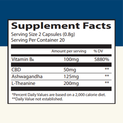 Each serving of CBD Calm Capsules is infused with 50 mg full-spectrum CBD, plus an effective trio of hard-working and time-tested active ingredients. We pair the robust benefits of the CBD you know and trust with 200 mg of the tension-taming amino acid L-Theanine, 125 mg of clinically studied Ashwagandha extract, and 100 mg Vitamin B6. Calm CBD Capsules provide a natural, convenient, and non-drowsy way to help stay centered throughout the day.