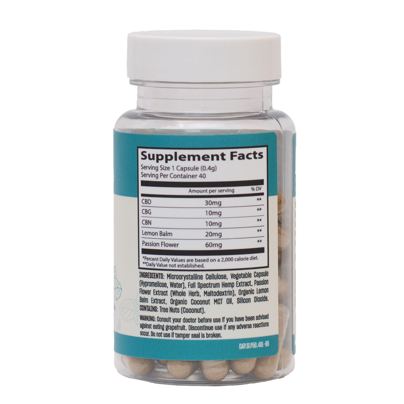 Our Sleep Capsules are specifically crafted for everyday use. Our effective blend of full spectrum CBD, CBG, and CBN works hard (with functional ingredients like lemon balm and passion flower) to target and reduce restlessness, promote healthier sleeping habits, and encourage a full night’s rest. Convenient and consistent, these 50mg capsules are perfect for any nightly routine seeking to maintain a regulated sleeping pattern.