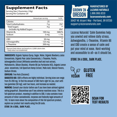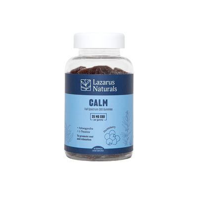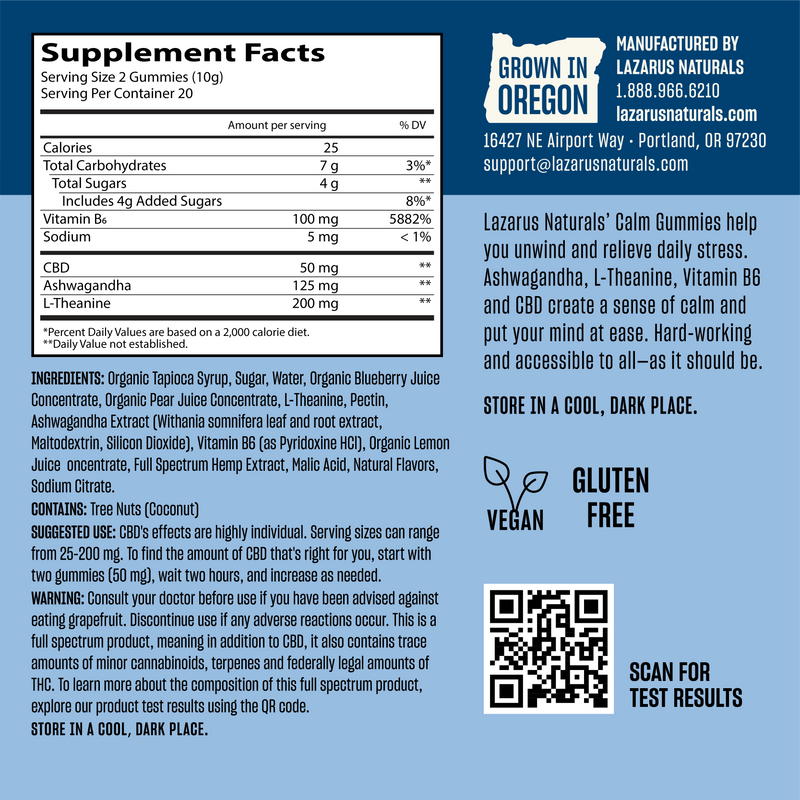 Now with an updated recipe! CBD Calm Gummies are infused with 50 mg full-spectrum CBD per serving, naturally derived fruit flavor, and an effective trio of hard-working and time-tested active ingredients. We pair the robust benefits of the CBD you know and trust with 200 mg of the tension-taming amino acid L-Theanine, 125 mg of clinically studied Ashwagandha extract, and 100 mg Vitamin B6. Calm CBD Gummies provide a natural, convenient, and non-drowsy way to help stay centered throughout the day — with the sweet-tart flavor of ripe huckleberry.