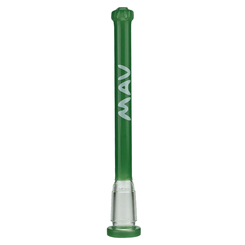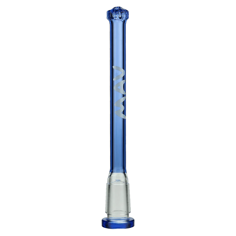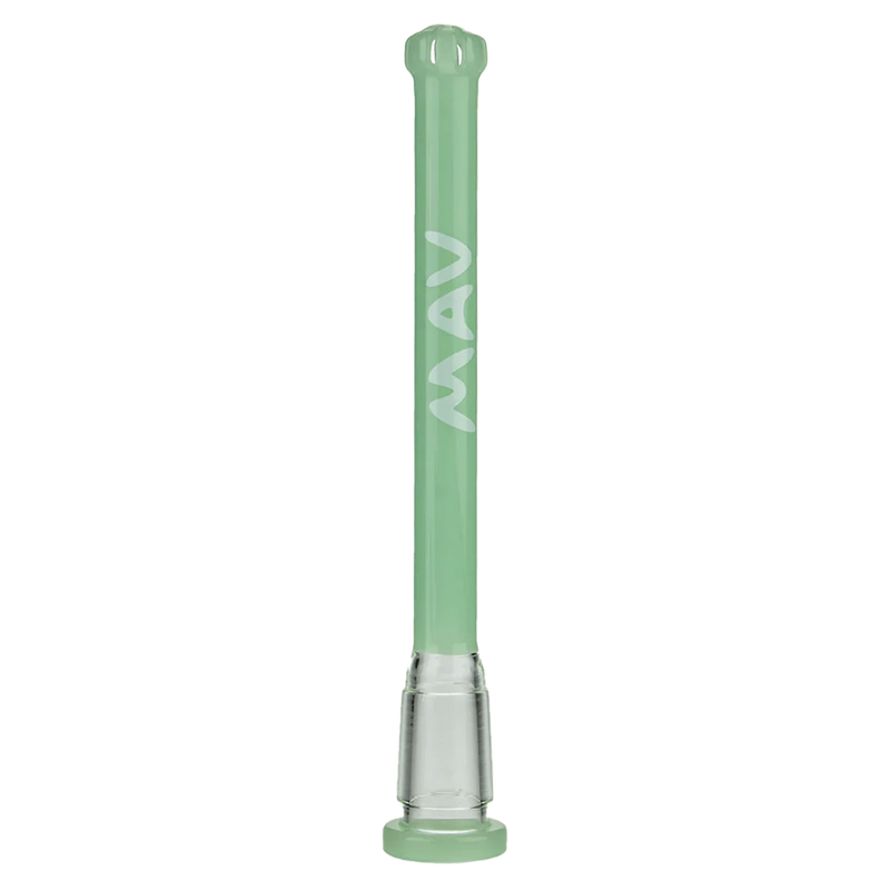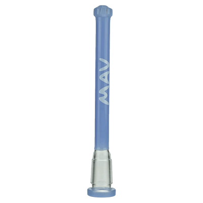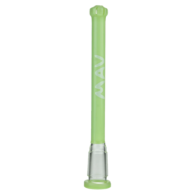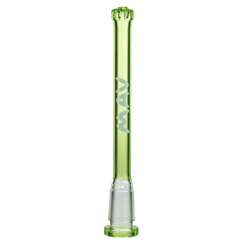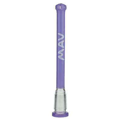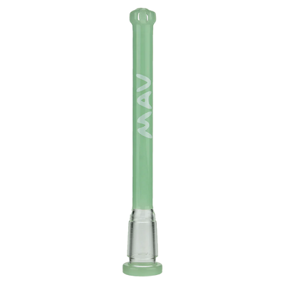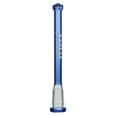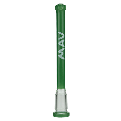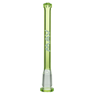 Upgrade your downstem with the colored showerhead slit downstem from MAV. Add some color and great filtration to your favorite beaker or straight. This downstem is 5" long measured from the end of the unground joint to the tip of the stem. The outer diameter is 18mm to fit in your 18mm female bong joint, the inner diameter is 14mm to fit your 14mm male bowl.