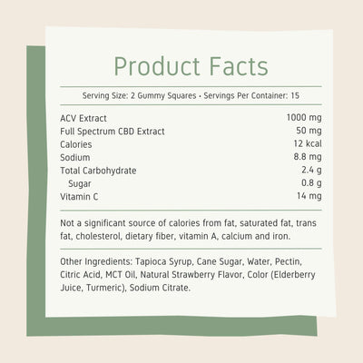 Apple Cider Vinegar CBD Gummies 1000MG is your new favorite way to support healthy inflammation. Each strawberry-flavored serving is packed with a 50MG dose of full spectrum CBD and acetic acid from ACV to support healthy immune function throughout the body — plus, they're a vegan-friendly gummy formula with 100% of your Vitamin B12 and folic acid daily requirements, so all can enjoy.