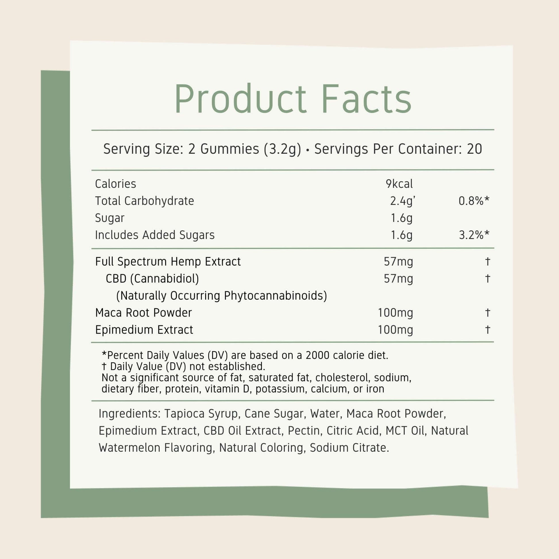Our CBD gummies for sex feature a loving blend of full spectrum cbd extract, maca root powder & epimedium. Maca root is known for its nutritional support and vitality-boosting properties, making it a key ingredient in this formula. Horny Goat Weed, with its rich historical use, adds vigor and passion, enhancing the blend's natural support for wellness and vitality. Bursting with a juicy watermelon flavor, these cbd sex gummies offer a simple & effective way to quickly ignite passion and enhance intimacy during romantic engagements. Each CBD gummy jar for sex comes with a total of 20 gummies, made to take 1 before intimate moments.