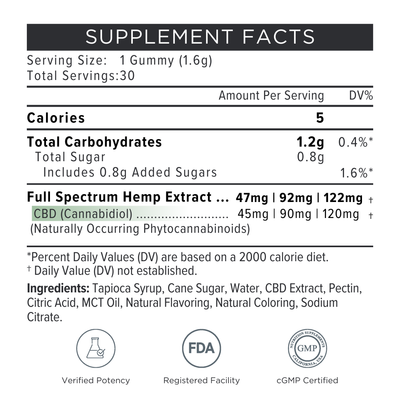 Our full spectrum CBD gummies are chewable candies infused with premium hemp extract. They contain a range of beneficial cannabinoids, terpenes, flavonoids, and less than 0.3% THC.