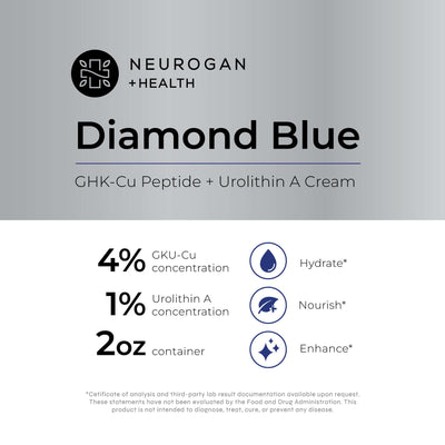 Diamond Blue Face Cream combines 4% GHK-Cu peptides and 1% Urolithin A to hydrate, nourish, and enhance your skin. In a 2 oz container, this cream is the first to blend these two best-selling ingredients together.Â
