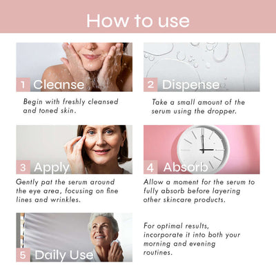 Usage: After cleansing and toning, apply a small amount of serum around the eyes and gently tap into the skin, avoiding direct contact with the eye. Use morning and night.