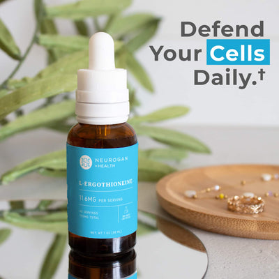 Our L-Ergothioneine drops deliver 11.6mg per serving of the antioxidant compound, with a total of 700mg in each bottle. Our refreshing dropper is crafted to fortify cellular defense against oxidative stress, thereby promoting vitality. Proudly made in the USA, Neurogan Health ensures a vegan, additive-free & dairy-free product. Our family business stands behind every high-potency, lab-tested bottle, produced in a cGMP-certified facility to support your journey to looking younger.