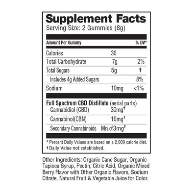 Ingredients:Â Full Spectrum Hemp Extract, Organic Cane Sugar, Organic Tapioca Syrup, Pectin, Organic Berry Flavor with Other Organic Flavors, Citric Acid, Sodium Citrate, Organic Fruit & Vegetable Juices for Color.