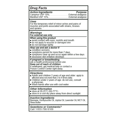 This PM stick goes to work the moment you swipe it on—no mess, no stress, just deep botanical relief when and where you need it. Powered by 11% camphor and 15% menthol, this formula cools on contact and stays in motion with you. Infused with lavender and honeysuckle, it calms the senses while easing joint stiffness and tension. No CBD, no synthetics, no petroleum junk; just clean, plant-based ingredients that put pain in its place.