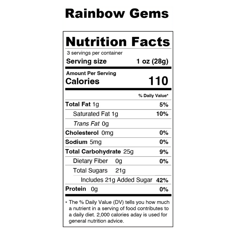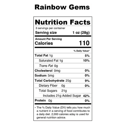 Rainbow Gems paint your day with flavorful color and bold, satisfying flavors. Each chew is like edible confetti: a mellow mix of tangy lemon, sweet strawberries, bold grapes, and zesty orange. With every crunch, these gems unleash a world of flavor.