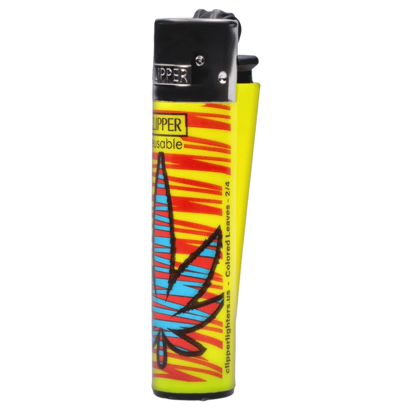 🔥 Clipper Lighter – Colored Leaves Edition – Bold and bright with trippy cannabis leaf art, this refillable Clipper hides a built-in packing tool and keeps your fire flowing — caveman approved.