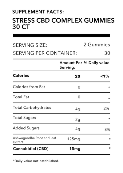 Double down on next-level stress relief with our delicious Calm CBD Complex Gummies. Harness the power of natural Ashwagandha and the healing properties of high-quality CBD to combat stress from the inside out. Our gummies are packed with potent whole-plant ashwagandha and CBD with superior absorption, making them more effective. - by reducing cortisol levels and regulating your body’s endocannabinoid system. We pride ourselves in using only the highest quality, all-natural, US-grown hemp, and our CBD is independently tested for purity and potency. Try our CBD Gummies today and experience the stress-relieving benefits for yourself.Â