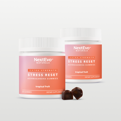 Enjoy NextEvo Naturals' Stress Reset Extra Strength Ashwagandha Gummies. Clinically shown to reduce cortisol levels, increase DHEA, support healthy stress levels, AND promote mood, emotional well-being, mental clarity, and energy levels. To top it all off, these convenient gummies taste great, too.