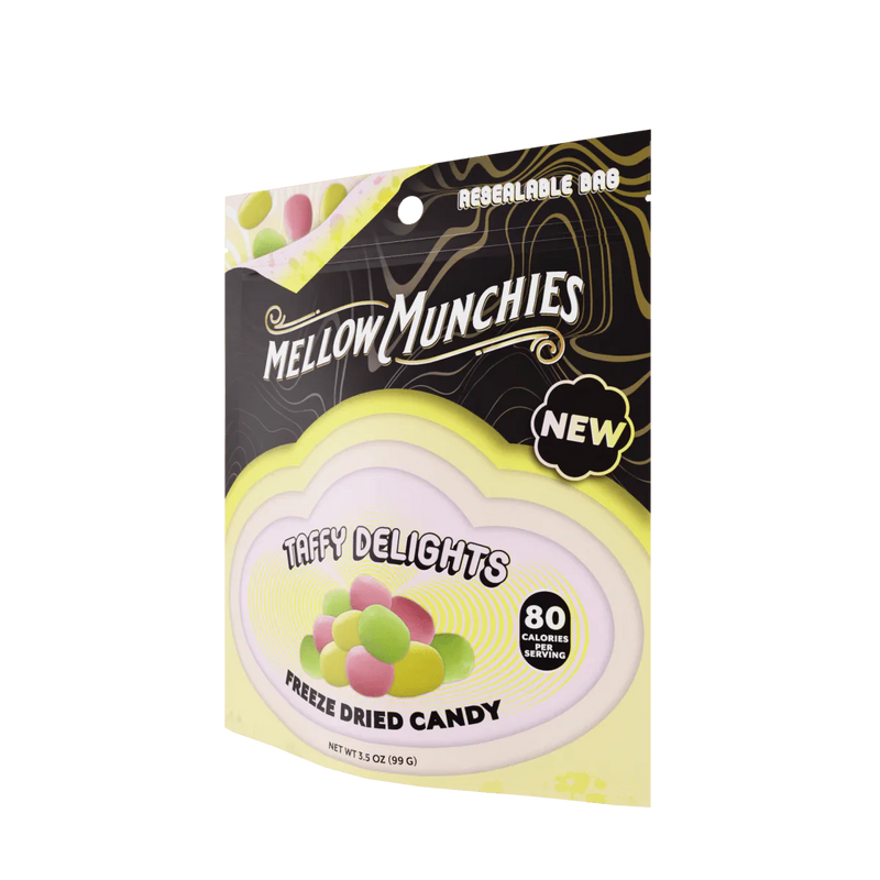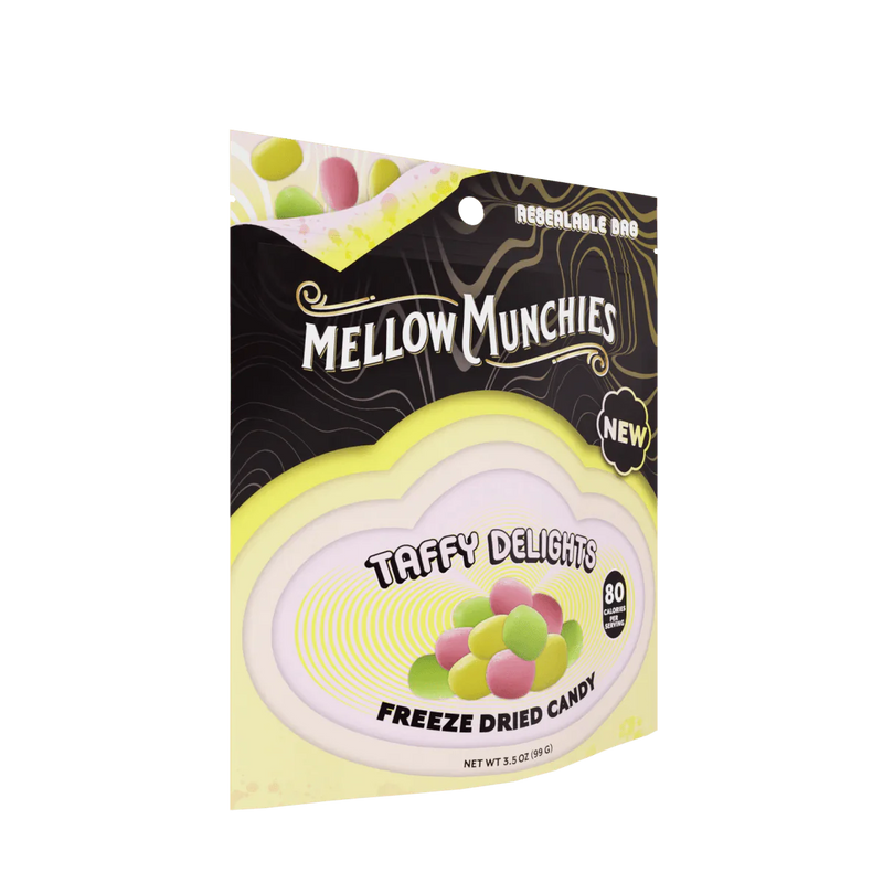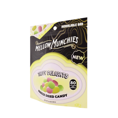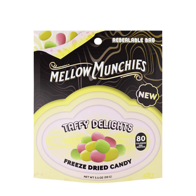 Taffy Delights freeze-dried candies bring you that nostalgic chewiness with a crunchy twist. These colorful little clouds start with a gentle crunch, melting into that familiar taffy goodness. Every bite is a chill and tasty journey, full of mellow vibes and sweet sensations.
