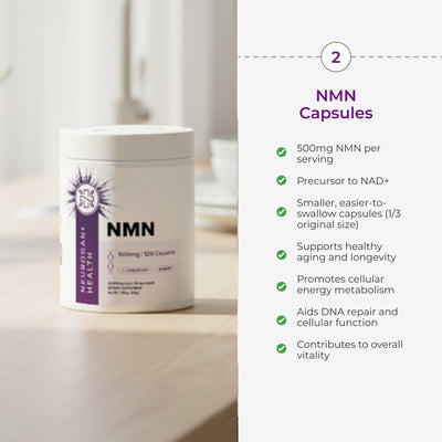 NMN Capsules (900 mg): Made with pure NMN powder, the direct precursor to NAD+ that our body is ready to absorb and convert. This is the fuel our cells need to perform virtually every function.