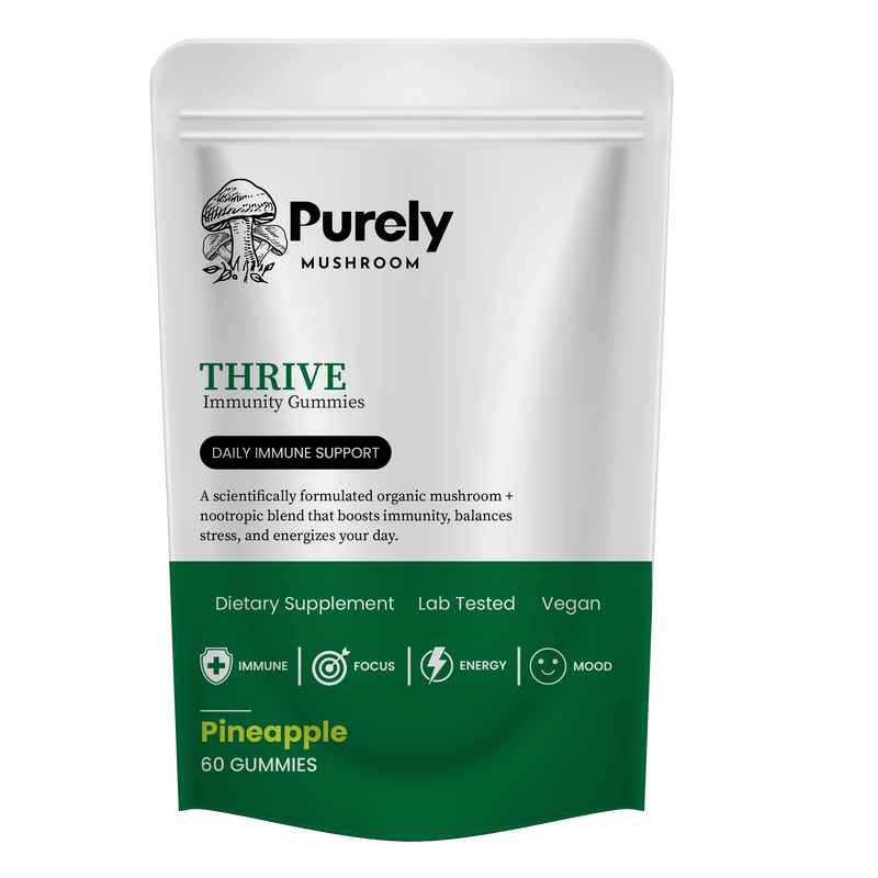 Fuel your immune system with the juicy pineapple goodness of Thrive Gummies by PurelyMushroom. This powerhouse blend features Reishi and Turkey Tail mushrooms for balanced immune function, Lion’s Mane for gut-brain support, Cordyceps for clean energy, and Zinc Glycinate for optimal immune cell performance.