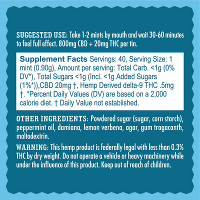 Take for: The calming effects of CBD without the mental high of THC. The 40:1 ratio of CBD to THC is great for first timers who want to take it slow. Zen can also be taken with any of our other mints to enhance the effects of CBD when combined with higher doses of other cannabinoids.